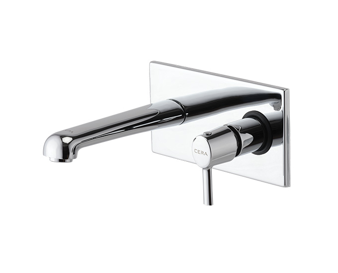 Wall mounted basin spout and operating lever consisting of exposed part and concealed part